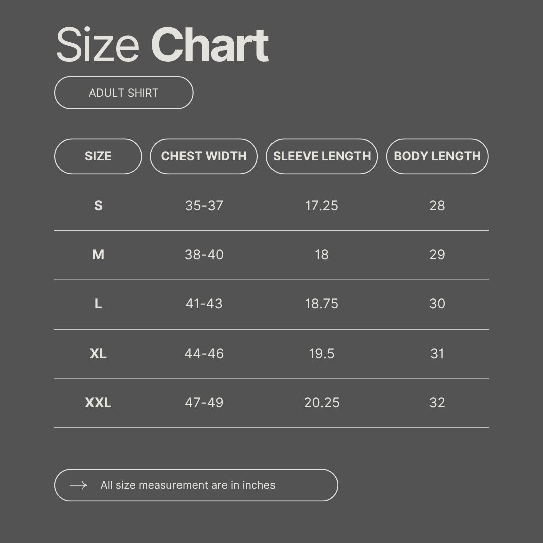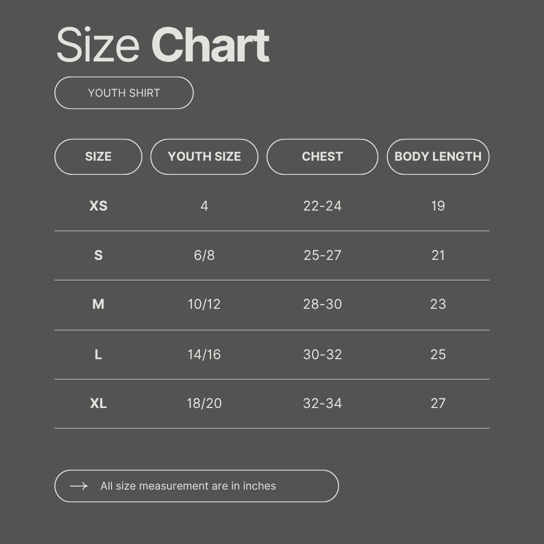 | Size | Youth Small, Youth Medium, Youth Large, Youth XL, Adult Small, Adult Medium, Adult Large, Adult XL, Adult XXL, Adult XXXL |